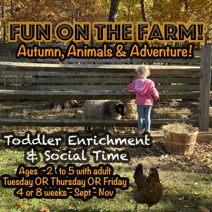 Don’t be intimidated! We are only “lightly” structured when it comes to our toddler programs. Each week’s chosen offerings are optional, and if your little(s) prefer to wander and explore the farm on their own or hang near the toys, go for it!